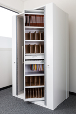 L’originalité du BICLASS ? Etre un module de classement double fond : deux volumes de classement placés dos à dos et pivotant dans une structure fixe. Cette conception astucieuse permet à la fois de réaliser des économies d’espace et de densifier le classement.