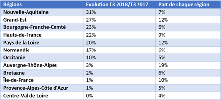 Au troisième trimestre, dans le secteur de l’industrie, toutes les régions sont en croissance en termes d’offres d’emplois. Le Centre-Val de Loire est stable. Avec +31% d’offres d’emplois par rapport au troisième trimestre 2017, la Nouvelle-Aquitaine est la région avec la plus forte croissance. En seconde place, on retrouve le Grand-Est (+27%) et la Bourgogne-Franche-Comté (+23%).