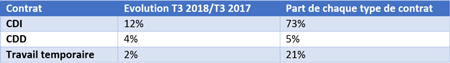 L’Industrie automobile, mécanique et navale propose principalement des contrats à durée indéterminée (73%) en croissance de 12% au troisième trimestre. Les CDD (+4%) et le travail temporaire (+2%) progressent de leur côté moins vite.