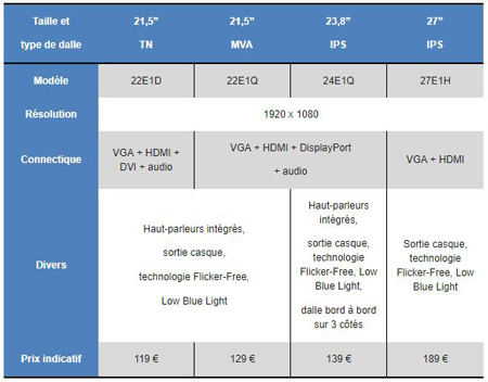 Déclinée dans un premier temps en deux modèles 21,5’’ / 54,61 cm - 22E1D et 22E1Q, équipés respectivement de dalles TN et MVA, la série E1 intègre sur les modèles 23,8’’ et 27’’ 24E1Q et 27E1H des dalles IPS offrant des angles de vision larges. Le 24E1Q se distingue par sa dalle bord à bord sur trois côtés, particulièrement adaptée aux configurations multi-écrans. Tous les modèles proposent un réglage de l’inclinaison (-3,5°/+21,5°) et sont compatibles VESA pour un montage mural ou sur bras articulé.