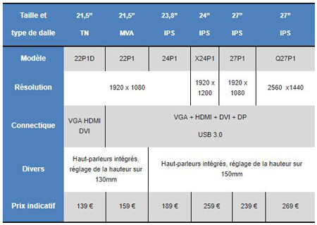 A l’exception du 22P1D – 21,5" à dalle TN, tous les autres moniteurs de la série P1 disposent d’un hub USB 3.0 à 4 ports, permettant le raccordement simple et rapide de multiples périphériques, et d’une connectique complète. Le segment 23,8’’(60,45 cm)/ 24” (60,96 cm) propose une alternative de choix entre le 24P1 en format 16:9 et le X24P1 en 16:10 – capable d’afficher deux pages A4 côte à côte. Tous deux embarquent une dalle IPS bord à bord sur 3 côtés. La série P1 comprend en outre un modèle 21,5’’ Full HD à dalle MVA, et décline ses modèles 27’’ en deux résolutions - Full HD et QHD.