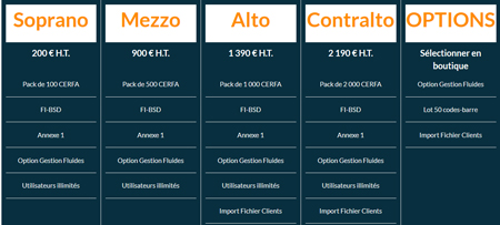 De plus, les formulaires CERFA sont systématiquement réactualisés sur la plateforme au regard des dernières directives règlementaires, et ce sans surcoût, évitant la confusion et l’accumulation de carnets papiers périmés. L’application C’Fluide est proposée en 4 offres, adaptées au nombre de fiches CERFA souhaitées, allant d’une mise à disposition de 100 à 2000 CERFA :