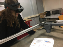 Son utilisation concrète : observer la manipulation du vérin à l’aide de la réalité augmentée permet de visualiser l’action de l’objet en contexte quasi-réel ainsi que son mécanisme intérieur et de comprendre son fonctionnement. Le casque de réalité augmentée donne également la possibilité de sélectionner virtuellement une pièce pour la visualiser de plus près sur le mécanisme.