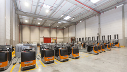 36 chariots à mât rétractable (FM-X), 17 transpalettes à conducteur porté (EXU-S), 78 préparateurs de commandes à levée ergonomique (CX-S), 6 gerbeurs double niveau (EXD-S).