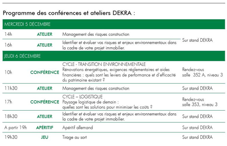 Cette année encore, DEKRA Industrial participe au Salon de l’Immobilier d’Entreprise (SIMI) du 5 au 7 décembre 2018 au Palais des Congrès à Paris. Spécialiste de la prévention et de la maitrise des risques, les experts de DEKRA Industrial seront disponibles pour répondre aux problématiques des visiteurs et leur apporter conseils, expertises et solutions. DEKRA Industrial propose également plusieurs ateliers et animera deux conférences :