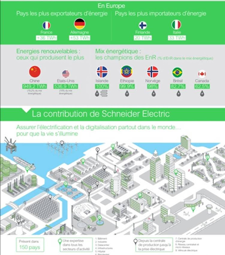 Allumer la lumière, charger un portable, autant d’actions qui sont devenues des réflexes ; pourtant réfléchir à la production, la consommation et la gestion de l’énergie ne l’est pas encore. Ainsi, peu de personnes savent qu’un smartphone consomme plus qu’un réfrigérateur ! Schneider Electric, le spécialiste mondial de la transformation numérique, de la gestion de l’énergie et des automatismes, a réalisé cette infographie qui permet non seulement de mieux comprendre la situation énergétique en France et en Europe, mais aussi d’avoir une vision d’ensemble sur l’utilisation et la production de l’énergie.