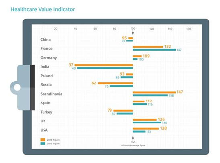 La force de la pression qui s’exerce sur les ressources des systèmes de santé peut globalement se définir en fonction de trois catégories : l’application des fonds, l’infrastructure et les compétences. Les résultats des patients ont été évalués en termes de taux de morbidité, de taux de survie et d’indicateurs officiels de la qualité de vie. Le modèle de l’étude de SFS exprime alors les résultats des patients sous forme d’un simple ratio de pression sur les ressources afin de donner une idée de la « valeur » générée par le système de santé. À titre d’exemple, si un système de santé a des ressources importantes (pression faible) et produit de meilleurs résultats (score élevé), alors l’indicateur de valeur sera supérieur.