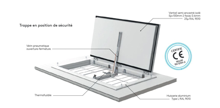 Certifiée CE EN 12101-2, la trappe Isofeu est un système de désenfumage naturel qui, conformément à la réglementation française, est doté d’un dispositif d’ouverture et de fermeture depuis le sol et répond ainsi parfaitement aux normes en matière de sécurité incendie. La trappe permet la maîtrise de l’évacuation des fumées, des gaz et de la chaleur qui pourraient entraver l’intervention des secours en cas d’incendie.