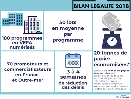 Commercialisée depuis l’automne 2017, la solution LegaLife de digitalisation du processus de vente dans le neuf est aujourd’hui utilisée sur plus de 180 programmes immobiliers neufs. Elle permet à l’acquéreur de réserver son appartement en ligne en générant automatiquement le contrat de réservation. Une fois le lot réservé, l’acheteur a accès à un compte personnel contenant l’ensemble des documents de son dossier d’acquisition. LegaLife permet ainsi d’accélérer le délai de traitement des dossiers tout en offrant aux acquéreurs une expérience d’achat 100 % digitalisée.