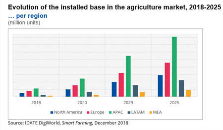 En 2025, on comptera quasiment 40 millions de dispositifs d’agriculture intelligente comprenant des applications liées aux plantes et à l’élevage et des machines agricoles, au niveau mondial. L’Asie-Pacifique sera vraisemblablement leader du marché sur la période 2018-2025.