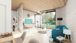 Chaque maison sera en effet composée d’éléments en 3D béton et d’un module implanté au nord, comprenant la cuisine, le cellier, l’entrée, les toilettes et la salle d’eau. Ces modules réalisés « hors-site » permettront des gains de délais, de performances et de qualité. Au sud de ces modules se déploieront des murs en béton imprimés 3D, réalisés avec des formes plus libres, courbes, en partenariat avec la start-up XtreeE et le groupe Vicat. Ces murs composent le séjour et les chambres et seront reliés aux modules grâce à des menuiseries vitrées créant des failles lumineuses avec connexions visuelles.