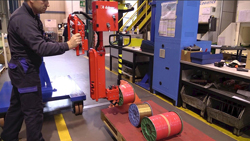 En l’occurrence, cette solution a été conçue par Dalmec pour favoriser la prise, le levage, le déplacement et la dépose de bobines de fil métallique, tenant compte de déplacements manuels dans divers lieux de travail de l’atelier grâce à une embase autostable déplaçable par transpalette, et dont les roues avant sont abaissables hydrauliquement.