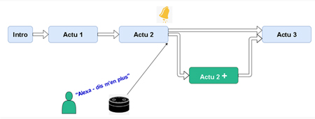 Avec ENCORE lorsque d’autres contenus audio sont disponibles, l’assistant vocal émet un son particulier signalant à l’auditeur qu’il y en a plus à disposition. Il suffit alors de formuler la demande par oral avec un : « Alexa, dis m’en plus ! » ou un « Ok Google, dis m’en encore ! » et l’assistant interrompt le fil d’actualité général pour lancer les contenus complémentaires sur le sujet et permettre à l’auditeur de creuser une actualité particulière.