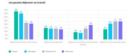 Les salariés français sont les champions des pauses déjeuner, tous pays confondus. Globalement, 39% d’entre eux en moyenne prennent une pause déjeuner d’au moins 30 minutes avec leurs collègues, et seuls 14% d’entre eux mangent assis à leur poste de travail. Ceci comparé aux anglo saxons (20% et 25% respectivement).