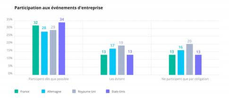 À noter que parmi les salariés français, ceux de la génération Z (18-21 ans) sont les plus réceptifs à ces événements. 56% d’entre eux y participent aussi souvent que possible, contre 25% pour les Baby Boomers (54-65 ans).