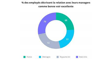 Globalement, les salariés français ont également de bonnes relations avec leurs supérieurs. 68% d’entre eux déclarent que leur relation est bonne ou très bonne. Mais pas autant que les anglais (72%) et surtout des américains (79%).