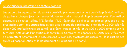 Le développement de la prestation de santé à domicile représente une réelle opportunité aussi bien pour les patients que pour le système de santé, dans son ensemble. Plus de 2 millions de patients bénéficient déjà d’une prise en charge à domicile, sur l’ensemble du territoire.