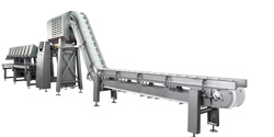 Le Flex Grader est un système intelligent, d’une grande flexibilité muni d’un convoyeur, de 4 à 24 bennes, de bras et d’une trieuse pondérale haut de gamme. Il est destiné aux transformateurs de volailles et viandes. Volailles entières ou portions, le Flex Grader établit une classification de lots par poids mini/maxi, poids cible, et/ou comptage de pièces. Les bennes disposées de part et d’autre du convoyeur, peuvent être affectées suivant les besoins de l’entreprise. Par exemple, 4 bennes aux filets de volaille d’un poids cible de 550 g, 2 autres d’un poids minimum de 350 g tandis que 4 autres recevront un mélange de 6 pièces, le tout à une cadence de 200 coups/minute, suivant l’application.