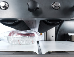 Les barquettes sont scellées au moyen de l’operculeuse haut de gamme QX-1100-SDL (Split Dual Lane), laquelle offre un concept inédit : deux machines en une. En effet, l’utilisateur dispose simultanément de deux voies totalement indépendantes en termes de technologie de scellage (Skinpack, Shrinck, inside, outside), poids, forme, film, composition du gaz de conservation…