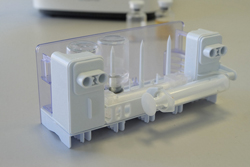 Comment cela fonctionne-t-il ? Il suffit de charger une cassette stérile à usage unique et quatre flacons dans l’unité de production et de lancer le processus. En seulement 15 minutes, la solution médicamenteuse est prête à l’emploi. La seringue remplie automatiquement peut alors être prélevée pour transférer la solution dans le nébuliseur et le patient peut commencer l’inhalation.