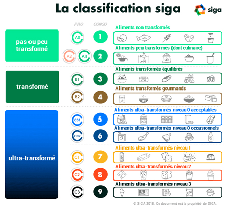 Cette nouvelle classification se veut plus complète et plus fine que les classifications de type Nutriscore, retenue par les pouvoirs publics français, qui se contentent de recenser les nutriments : quantité de protéines, acides gras, sucres, vitamines et minéraux. Siga, pour sa part, s’inspire de la classification NOVA qui trie les aliments en fonction de leur degré de transformation en partant du constat qu’un régime alimentaire à base de produits ultra-transformés favorise le développement de maladies chroniques.