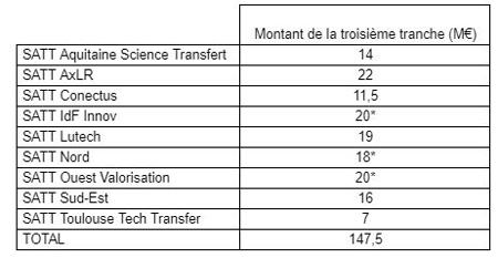 Pour six d’entre elles, la décision de refinancement prévoit d’ores et déjà un engagement sur trois années supplémentaires : Aquitaine Science Transfert, AxLR, Conectus, Lutech, Sud-Est et Toulouse Tech Transfer ;