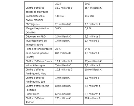 L’EBIT ajusté de 2,1 milliards d’euros (contre 2,3 milliards d’euros en 2017) est essentiellement impacté par la hausse des dépenses en R&D, par la hausse des prix des matériaux, par les effets de change négatifs et par un marché affaibli. La marge d’exploitation ajustée s’élève à 5,6 % et le cash-flow disponible ajusté des rachats et des cessions d’entreprises atteint 0,9 milliards d’euros.