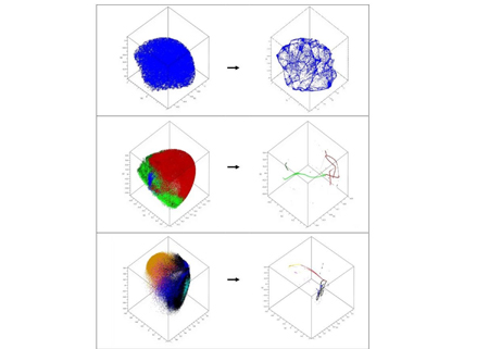 Le Groupage Quantique Dynamique (Dynamic Quantum Clustering - DQC) réalise cet exploit en créant une carte de densité de données à l’aide de la bibliothèque Maple propriétaire de DQC et des puissants outils de visualisation de Maple. L’analyse DQC se traduit par une animation Maple fournissant une preuve visuelle des calculs complexes qui se déroulent en coulisses. Selon Marvin, les animations Maple ont constitué une part importante du succès du DQC car elles révèlent des réponses sans les mathématiques complexes. Selon lui, « ces animations vendent notre produit en exploitant l’aptitude de l’être humain à repérer des modèles qui se développent dans le temps et dans l’espace ».