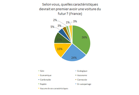 L’étude confirme la prise de conscience environnementale des Européens. Pour 24% des Français et des Allemands, 23% des Britanniques et même 30% des Italiens, la caractéristique la plus importante de la voiture du futur est son impact écologique, cependant que pour seulement 14% d’entre eux (moyenne pour les quatre pays analysés) elle doit être avant tout économique. Cette question est d’autant plus importante pour les jeunes générations : les Français de 18 à 24 ans passent même l’écologie devant la sécurité, à un point près (33% contre 32% pour la sécurité).