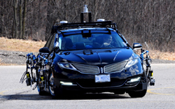 Krzysztof Czarnecki et Steven Waslander contribuent depuis deux ans sur le projet dont ils supervisent la planification et les recherches sur la navigation. Ils ont récemment fait appel à John McPhee, titulaire d’un titre de recherche au Canada et Professeur en ingénierie et conception de systèmes de l’Université de Waterloo, pour améliorer le contrôleur de mouvement du véhicule et superviser la dynamique et les aspects de contrôle du projet. L’équipe de chercheurs a choisi une Lincoln MKZ Hybride 2015 comme plate-forme véhicule et a utilisé Maple et MapleSim de Maplesoft pour soutenir ses recherches. Elle a équipé la voiture de capteurs et actionneurs indispensables à la mise en œuvre d’un véhicule autonome. « La Lincoln MKZ est le véhicule privilégié par AutonomouStuff, la société qui a transformé la MKZ en véhicule drive-by-wire », confie John McPhee. « Nous avons pu ensuite ajouter nos propres capteurs (lidars, caméras, etc.) et systèmes de contrôle pour assurer l’autonomie totale du véhicule ».