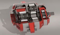 Dans les transmissions à engrenages, les réducteurs à deux ou trois étages planétaires sont aujourd’hui monnaie courante. Ces étages planétaires sont souvent associés à un étage d ́engrenages hélicoïdaux. Depuis plusieurs années, la tendance est à l’utilisation d ́engrenages planétaires dits « intégrés ». Pour cette application, NSK a développé (en étroite collaboration avec le fabricant d’engrenages) des roulements à plusieurs rangées de rouleaux coniques et cylindriques sans bague extérieure. L’alésage des engrenages épicycloïdaux est ainsi utilisé comme chemin de roulement extérieur.