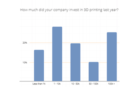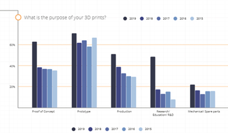 L’enquête montre que les entreprises consacrent un budget encore plus important à leurs activités de fabrication additive : comparé à 2018, les investissements ont doublé et 25,6% des entreprises interrogées ont investi plus de 100 000 dollars, contre 12% l’année précédente. Ces sociétés ont compris tous les avantages de cette technologie pour leur secteur et investiront probablement d’avantage dans l’impression 3D l’année prochaine. 20% d’entre elles déclarent qu’elles augmenteront leur investissement de plus de 100%. Positionnés à la pointe de l’innovation, les plus fervents utilisateurs travaillent avec cette technologie depuis plus de 3 ans. Parmi toutes les répondantes et tous les répondants, 47% des plus importants utilisateurs de l’impression 3D augmenteront leur investissement d’au moins 50% au cours de l’année. Parmi les avantages, tels que la réduction des coûts et le court délai d’exécution, 70% des professionnels (contre 48% l’année dernière) ont indiqués les géométries complexes comme un avantage.