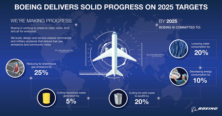 En 2018, Boeing a dévoilé sa nouvelle stratégie environnementale qui vise des objectifs ambitieux : innover au nom de la performance, travailler à l’excellence en matière de développement durable et inciter à la collaboration mondiale à l’horizon 2025.