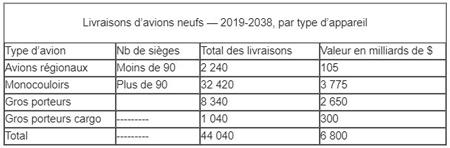 Le segment des avions monocouloir tels que le 737 MAX demeure le plus important. En effet, les besoins des compagnies sont évalués à 32 420 nouveaux appareils. Ce marché chiffré à 3 800 milliards de dollars est dans une large mesure tiré par la solidité confirmée des compagnies à bas coûts, la forte demande d’avions de remplacement, et la croissance continue de la région Asie-Pacifique.