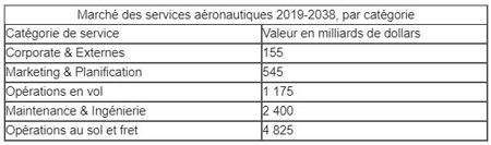 La flotte d’avions mondiale va continuer de générer une demande significative au bénéfice des services aéronautiques : chaîne des fournisseurs (pièces et gestion logistique des pièces), services de maintenance et d’ingénierie, modification d’avions et soutien aux opérations des compagnies aériennes. Au cours des 20 prochaines années, Boeing évalue le marché des services aéronautiques à 9 100 milliards de dollars, avec une croissance annuelle de 4,2 %.