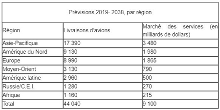 Selon cette nouvelle édition du CMO, l’augmentation conjuguée du nombre de passagers transportés et du nombre d’avions mis hors service nécessitera l’acquisition de 44 040 appareils neufs d’une valeur de 6 800 milliards de dollars au cours des deux prochaines décennies. Ces chiffres représentent une hausse de 3 % par rapport à l’année dernière. La flotte mondiale d’avions commerciaux exigera des prestations de services évaluées à 9 100 milliards de dollars, ce qui, au total, représente un marché dépassant 16 000 milliards de dollars d’ici à 2038.