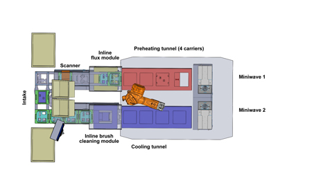 EUTECT propose des machines-cellules avec des dimensions allant jusqu’à 2700 mm x 1600 mm. Ces dimensions de cellule sont en partie nécessaires car les clients intègrent dans la machine jusqu’à sept étapes de travail ainsi que la robotique associée. "Nous avons travaillé sur une vaste gamme de produits jusqu’à présent. Nous avons notamment intégré une station d’entrée, un robot à six axes montés en plafond, un scanner d’entrée, un module de fluxage, un tunnel de préchauffage, deux minivagues, un tunnel de refroidissement et une station de nettoyage à brosse dans une seule cellule. A cela s’ajoutait le porte-pièce avec les masques titane intégrés ", a déclaré Matthias Fehrenbach. Tous les modules font partie du kit de modules d’EUTECT, qui permet de simplifier considérablement la gestion, le développement et l’intégration de projet, ainsi que le démarrage, la formation du personnel et la maintenance.