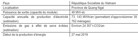 Cette nouvelle centrale solaire possède une puissance d’environ 49 MW-c.c., avec une production annuelle d’électricité estimée à 73 143 MWh. L’équivalent de la quantité consommée en un an par près de 38 762 ménages vietnamiens moyens.