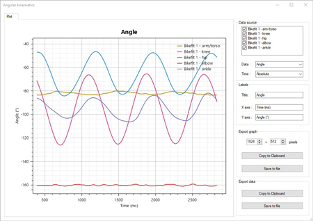 Les changements d’angles des articulations pendant le pédalage sont représentés sous forme de diagramme à l’aide du logiciel. La trajectoire de marqueurs placés à des endroits précis sur le cycliste sert de base à cet effet.
