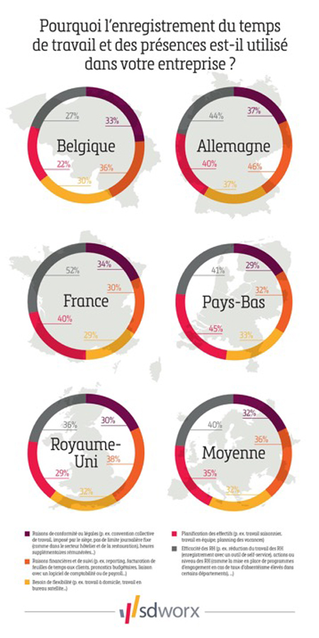En Belgique, les raisons les plus fréquentes justifiant l’enregistrement du temps de travail et des présences sont l’aspect financier et le suivi (36 %), tout comme en Allemagne et au Royaume-Uni. La conformité (33 %) arrive en deuxième position et le besoin de flexibilité en troisième (30 %). Parmi les autres raisons invoquées en Belgique, on trouve l’efficacité des RH (27 %) et la planification des effectifs (22 %). La Belgique obtient le score le plus bas de tous les pays lorsqu’il s’agit d’utiliser l’enregistrement du temps de travail et des présences à des fins de planification des effectifs (22 %) et d’efficacité des RH (27 %).
