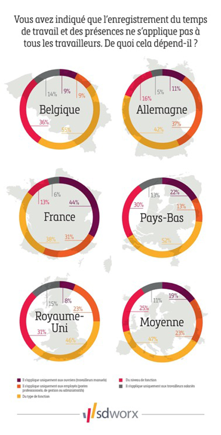 Ce système est surtout populaire au Royaume-Uni : 63 % des répondants indiquent l’appliquer à tous leurs travailleurs. En dessous de la Belgique, on retrouve les Pays-Bas, avec 42 %. Les organisations néerlandaises sont les plus sélectives en matière de suivi, 23 % des entreprises utilisant l’enregistrement obligatoire du temps de travail et des présences pour une partie de leurs travailleurs uniquement. Parmi tous les pays sondés, c’est en France où l’on applique le moins souvent les systèmes de suivi.