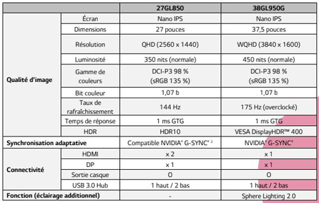Disponibles en 38 pouces (modèle 38GL950G) et 27 pouces (modèle 27GL850), les deux moniteurs UltraGear Nano IPS réunissent un taux de rafraîchissement extrêmement rapide de 144 Hz, une haute résolution (38GL950G : 3840 x 1600, 27GL850 : 2560 x 1440) et une gamme de couleurs étendue (DCI-P3 98 %) pour produire des images précises incroyablement éclatantes et sans scintillement. Le moniteur de plus grande taille est conçu pour renforcer la sensation d’immersion du gamer, grâce au format 21:9, un écran incurvé, un cadre à peine visible, une fonction Sphere Lighting 2.0 améliorée, ainsi que des éclairages RGB à l’arrière de l’écran pour renforcer l’atmosphère de la partie en modulant les couleurs des éclairages selon ce qui s’affiche à l’écran. Le modèle 27 pouces UltraGearTM est compatible NVIDIA® G-SYNC2 et prend en charge le HDR10, tandis que le modèle 38 pouces prend en charge à la fois le processeur NVIDIA G-SYNC et le VESA DisplayHDRTM 400. Il est certifié NVIDIA par plus de 300 tests de performance et de qualité d’image garantissant une expérience de gaming extraordinaire. Les deux moniteurs assurent une parfaite fluidité des mouvements, sans déchirures ni saccades, et disposent de paramètres gaming spécifiques tels que le mode Dynamic Action Sync, le Black Stabilizer et la fonctionnalité Crosshair afin d’atteindre une précision extrême, notamment pour les jeux FPS.