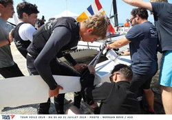C’est dans la troisième manche de qualification que les deux bateaux sont entrés fortement en contact. Cet incident a occasionné un trou spectaculaire sur le flotteur tribord du Diam 24 Groupe Atlantic mené par le jeune Clément Cron. Un accident qui pouvait le mettre hors-jeu pour la journée alors qu’avec ses équipiers, Aristide Gasquet et Paco Lepoutre, il venait de réaliser deux belles premières manches (3e puis 2e).