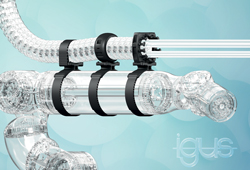 Les cobots ont trouvé leur place dans la production, non seulement chez les grands acteurs industriels. On les trouve de plus en plus dans les petites et moyennes entreprises. L’automatisation de certaines parties du process permet en effet aux entreprises d’être compétitives sur le marché. Les robots collaboratifs collaborent très étroitement avec l’homme. Capteurs, caméras et un guidage de l’énergie garantissent la sécurité des process automatisés. Pour que les câbles et tuyaux nécessaires puissent être guidés de manière sûre au plus près des cobots, igus a mis au point sa série de chaînes porte-câbles tridimensionnelles triflex R. Et pour que cette chaîne ou une gaine protectrice soit solidement fixée au robot, igus propose maintenant à l’utilisateur de nouvelles fixations fines. Ces fixations universelles à bande Velcro ont une forme qui leur permet de s’adapter à tous les bras de robot. Une structure fine aux angles arrondis améliore la sécurité des opérations en réduisant le risque de blessure lors d’un contact avec le robot.