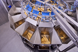 Les 2 associatives traitent la mise en boîtes de morceaux de poisson pané surgelé de 160 et 300 g, ce dernier format à la cadence de 40 boîtes/minute (720 kg/poisson/heure) avec une précision de 2 à 3 %, cadence remarquable au regard de ce produit difficile à traiter. En effet, comme il s’agit de poisson surgelé, il est impératif d’ajuster finement la vitesse du process afin d’assurer l’écoulement régulier du produit, sans aucune accumulation. Les 2 peseuses, parfaitement étanches, sont entièrement fermées pour maintenir une température constante.