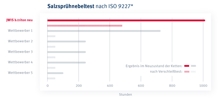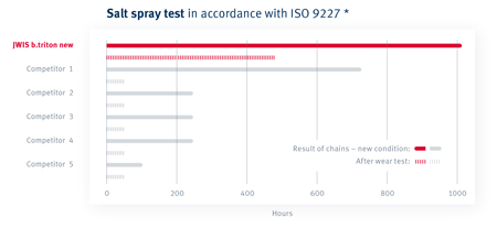 Grâce à l’alliance de la technologie du zinc lamellaire hautes performances avec un traitement de surface spécial, les chaînes JWIS b.triton résistent davantage à la corrosion que les produits concurrents comparables, comme le prouvent les résultats d’essais standard. Hautement durables, ces nouvelles chaînes à rouleaux sont en outre écologiques, car elles sont fabriquées à partir de matériaux certifiés RoHS et exemptes de chrome hexavalent (CrVI).