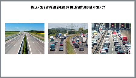 L’environnement de production traditionnel a des limites systémiques (voir figure 2). La figure 2 représente à gauche une route à faible trafic symbolisant la sous-utilisation des ressources. Si on l’applique à la fabrication, cela représente un coût de production élevé par pièce terminée. La route de droite, encombrée de véhicules arrêtés, représente un certain chaos et les délais prolongés lorsque des erreurs se produisent ou que des travaux imprévus se disputent l’espace sur la route de production. L’image du milieu illustre une approche équilibrée et rentable du rendement et de l’utilisation des ressources.