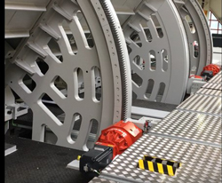 Les ingénieurs de Redex ont conçu un entraînement pivotant constitué de quatre segments individuels de couronne dentée entrainés par autant de réducteurs avec pignons de sortie intégrés. Le mouvement de rotation fourni par chaque servomoteur pilote le pignon de sortie de chaque réducteur planétaire à trois étages (Série Redex KRPX), avec un rapport de réduction de 310 et un couple de sortie maxi de 10 050 Nm. Au total, c’est un couple maxi d’environ 600 000 Nm qui peut être appliqué sur l’axe de la table rotative.