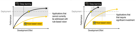 Figure 1 : Les principales différences entre la vision industrielle classique et le deep learning incluent le processus de développement (programmation de chaque outil à partir de règles contre apprentissage à l’aide d’exemples), l’investissement matériel (le deep learning nécessite davantage de traitement et d’espace de stockage) et les scénarios d’utilisation en automatisation industrielle.