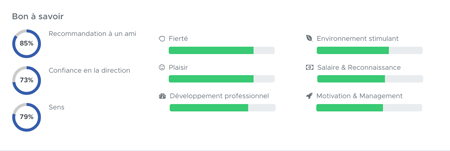 Lors de son questionnaire, ChooseMyCompany audite les entreprises autant sur les process, les résultats clients mais aussi sur des critères essentiels pour le bien-être des collaborateurs : confiance, fierté, plaisir du travail en équipe, qualité du management ou encore recommandation de leur société, etc.